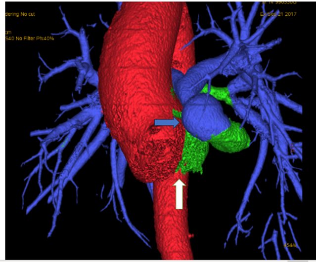 Figure 3: Common trunk (White arrow) which continues as ascending aorta, main pulmonary artery (Blue arrow) which is tortuous and elongated arising from the posterior aspect.