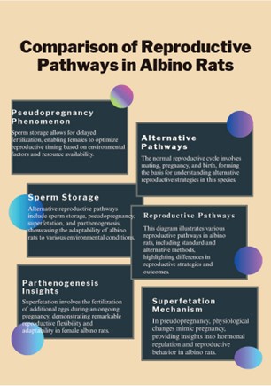 Figure 1: Comparison of reproductive pathways in albino rats, highlighting standard and alternative mechanisms including pseudopregnancy, sperm storage, superfetation, and parthenogenesis. The figure illustrates the physiological adaptability of albino rats to diverse environmental conditions through multiple reproductive strategies.