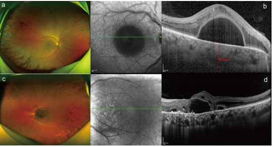 A 59-year-old man presented with bilateral decreased vision for 1 month. Visual acuity was 20/40 in the right eye (RE) and 20/80 in the left eye (LE). Scanning laser ophthalmoscopy (SLO) showed bilateral white centered retinal hemorrhages (Figure 1 a and 2 a). Optical coherence tomography (OCT) showed significant schisis-like intraretinal fluid and cystoid space in the RE (Figure 1 c), and a large characteristic serous macular detachment (SMD) associated with intraretinal fluid in the LE (Figure 2 c). Fluorescein angiography (FA) demonstrated retinal blood vessels were dilated and segmented, late FA illustrated numerous remarkable microaneurysms and capillary non-perfusion, but without leakage in the macula (“silent FA”) (Figure 1 b and 2 b). Blood investigations showed anemia of 54 g/L and immunoglobulin M (IgM) markedly elevated >25 g/L. Six months later, bone marrow biopsy showed an extensive proliferation of plasmocyte and later lymph node biopsy confirmed the diagnosis of lymphoplasmacytic lymphoma. His underwent local retinal laser photocoagulation and 5 courses of chemotherapy.