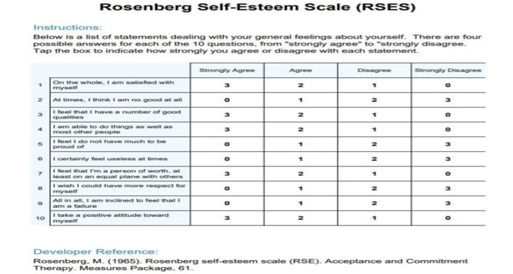 1- Rosenberg Self- Esteem Scale: self-esteem scale is a questionnaire designed to measure an individual's overall sense of self-worth, with the most widely used being the Rosenberg Self-Esteem Scale (RSES). This 10-item scale assesses both positive and negative feelings about the self, using a 0–30 scoring range, where higher scores indicate higher self-esteem.