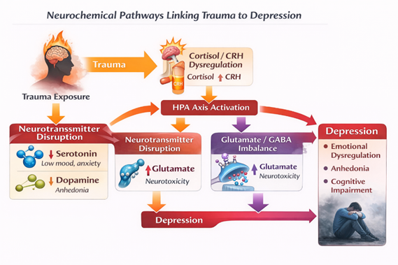 This review examines the current evidence connecting trauma exposure to neurochemical alterations that predispose individuals to depression. Trauma-induced activation of the hypothalamic–pituitary–adrenal (HPA) axis leads to sustained cortisol release, which disrupts neurotransmitter balance and impairs neuroplasticity in key brain regions such as the hippocampus, amygdala, and prefrontal cortex. Reduced serotonin availability, impaired dopamine reward signaling, and excessive glutamatergic excitation collectively contribute to anhedonia, emotional numbing, and negative affect.