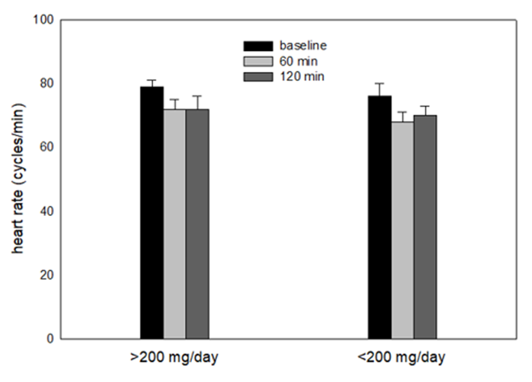 In the current experiment we have found that whether the university student consumes less than 200 mg/day or more than 200 mg/day, caffeine does not affect heart rate, at least in the first 120 minutes post-consumption. These results are consistent with other results we have published in the past few years (4-8). This appears to be the case whether caffeine is consumed as a pill, or in coffee, energy drinks, soda, tea, etc. We have also found our conclusion to be true over the range of doses of 100-400 mg caffeine (we have not examined lower or higher doses) (3-7). We have opinions why others get conflicting results, but our opinions are probably best reserved for a philosophical/psychological debate on the subject.