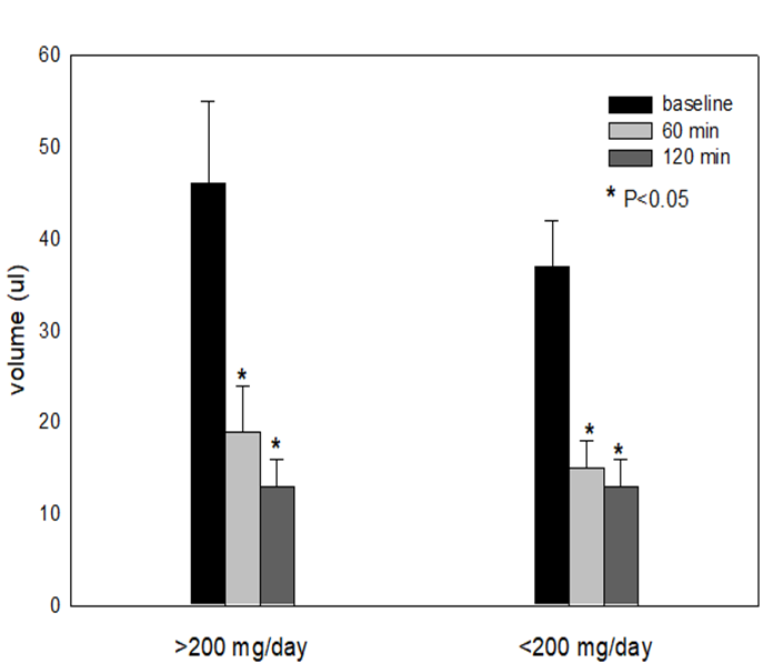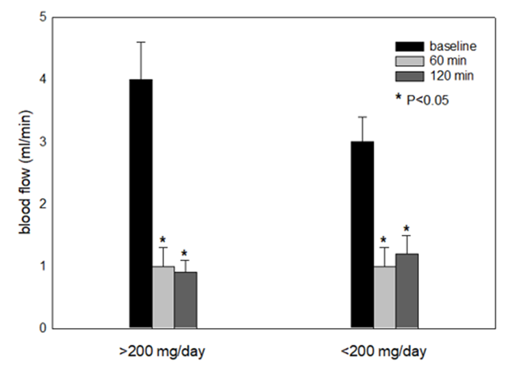 were markedly and significantly (P<0.05) reduced at both 60- and 120-minutes post-caffeine. For example, in the baseline, pre-caffeine state finger volumes were 46 ± 9 and 43 ± 4, respectively for the >200 mg/day and <200 mg/day groups. By 60 minutes, volume decreased to 18 ± 4 in both groups, and by 120 minutes, volume for >200 mg/day vs < 200 mg/day groups were 13 ± 3 and 17 ± 6 respectively (P<0.05, vs corresponding baseline values). For finger blood flow (ml/min) numbers were: 4.0 ± 0.6, 3.0 ± 0.4 (baseline), 1.0 ± 0.3 for both groups (60 minutes, P<0.05 vs corresponding baselines),