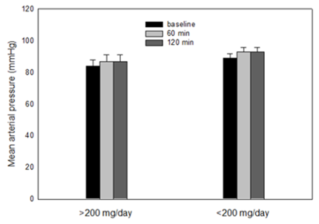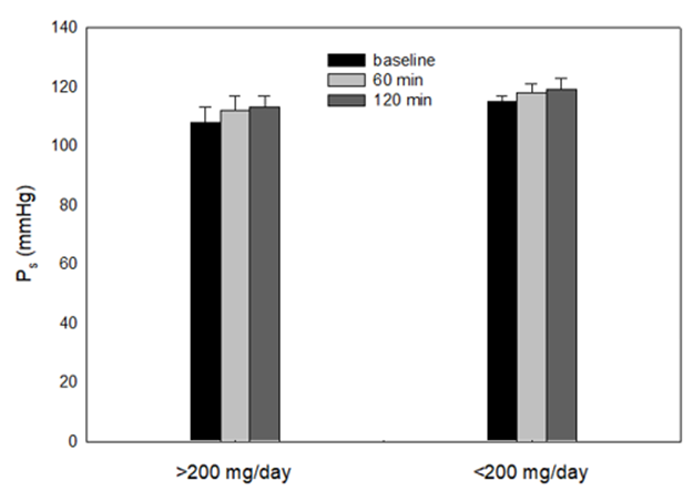 All data were continuously captured by an electronic data acquisition system (Model 26T, ADInstruments, Colorado Springs) coupled with a desktop computer running Lab Chart software (v. 8.1.30, July, 2024). Our null hypothesis (H₀) stated that cardiovascular function would not differ between individuals consuming >200 mg/day of caffeine and those consuming <200> 200 mg/day vs < 200>