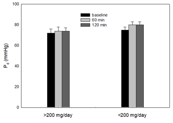 Figures 5, 6, and 7 present data for systemic arterial blood pressures: Pā (mean arterial pressure, mmHg), Ps (systolic pressure, mmHg), and Pd (diastolic pressure, mmHg). In all cases post-caffeine, there were numeric trends towards an increase. However, at the physiological standard, P<0>200 mg/day), and from 112 ± 4 to 116 ± 6 mmHg (<200> 120 minutes post-caffeine. Similar numbers were obtained at 60 minutes post-caffeine.