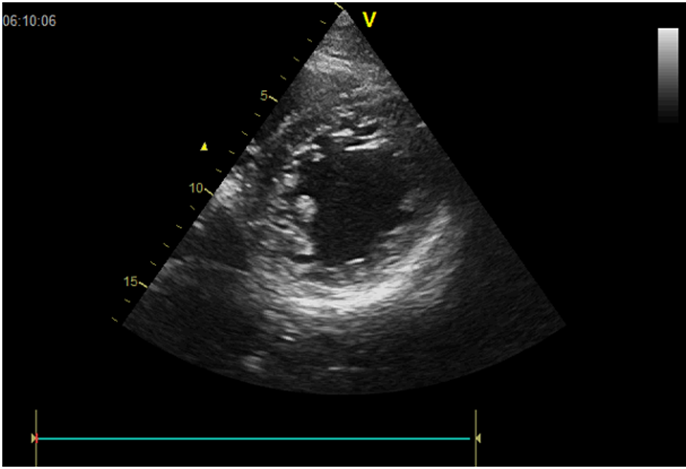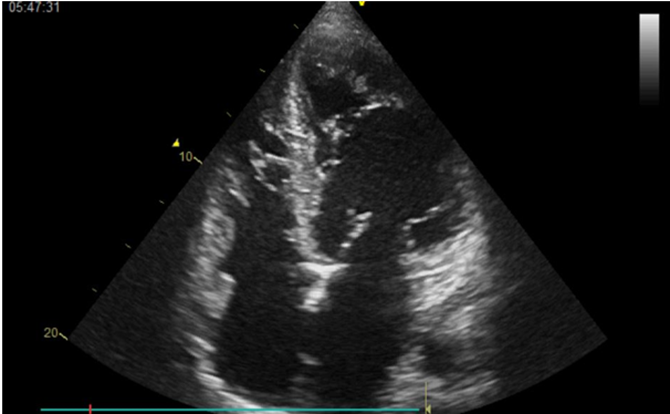 Echocardiography confirmed a severely depressed left ventricular ejection fraction (LVEF) of 20%, with a markedly dilated left ventricle, prominent trabeculations, spontaneous echogenic contrast, and an apical thrombus—all features raising suspicion of a left ventricular non-compaction cardiomyopathy (LVNC) (figure 2 and 3)