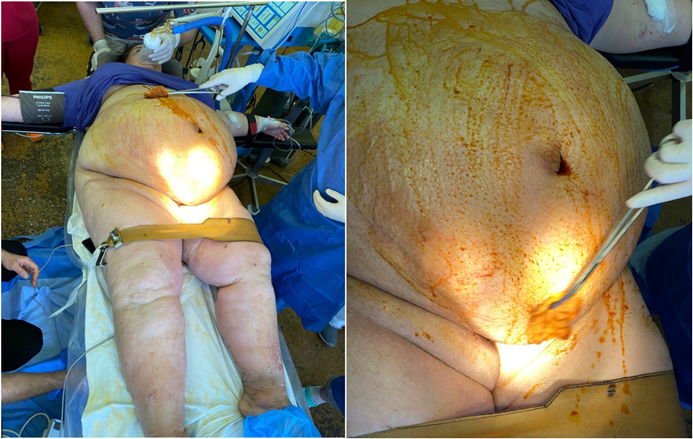 Figure. 1,2: Pregnant woman L., with morbid obesity, generalized edema against the background of severe combined preeclampsia and indurative edema of the panniculus, which made access to the lower segment of the uterus impossible.