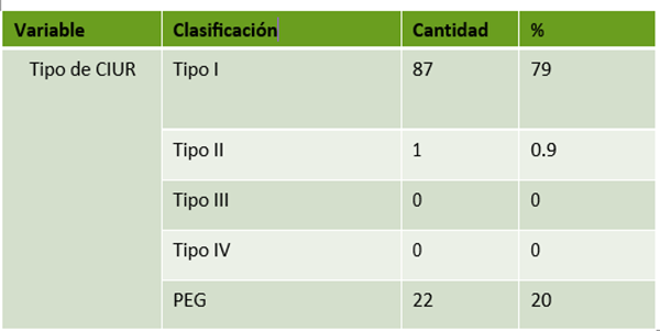 According to Table 2, the predominant type of URIC was type 1 with 79.10%, since these are growth restrictions with hemodynamics normal according to the functions of the Hospital where the study was conducted and no type 3 and 4 CIUR were presented.