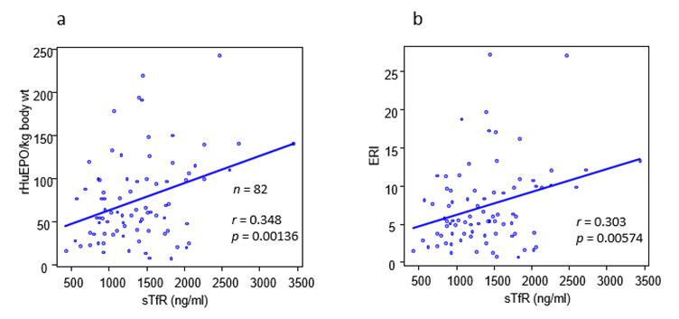 Figure 5: Correlation between serum hepcidin levels and serum sTfR values (a) and the sTfR index (b).