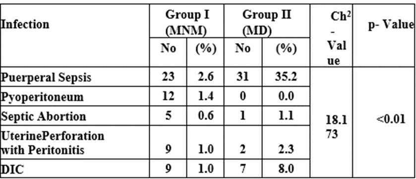 Among 58 women with near-miss with infection, 23 (2.6%) had puerperal sepsis, 12 (1.4%) had pyoperitoneum, 5 (0.6%) had and 9 (1%) had both uterine perforations with peritonitis and DIC due to puerperal sepsis, whereas among 41 women who had a maternal death, 31 women (35.2%) had sepsis followed by 7 (8%) with septic DIC, 2(2.3%) uterine perforation with peritonitis and 1 (1.1%). So both groups had statistically significant differences (p-value greater than 0.001).