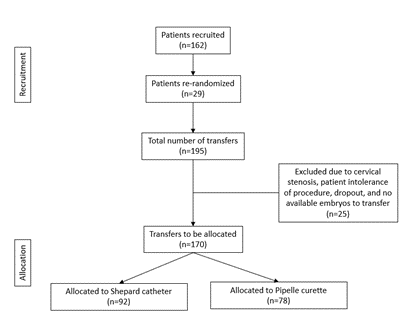 A total of 162 patients were recruited and 29 of these patients were re-randomized in subsequent embryo transfer cycles. Of the 195 transfers included in this study, 25 cycles were excluded for cervical stenosis, patient intolerance of procedure, patient drop-out of study, and no available embryos for transfer. Thus, 170 transfers remained. Seventy-eight patients were assigned to the to the Pipelle arm, and 92 patients were randomized to the Shepard arm (Figure 1).
