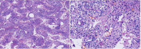 In addition, extrapulmonary LAM may be associated with various manifestations of PEComa family tumors or tuberous sclerosis (TSC). Of note, it is unclear whether all patients with extrapulmonary LAM also have pulmonary LAM or are at risk of developing pulmonary LAM. Therefore, the potential relationship between LAM and TSC needs to be of particular concern in patients with clinically occult LAM involving the pelvic lymph nodes, which is incidentally detected during surgical staging of uterine and ovarian malignancies, and long-term follow-up is recommended. Searching the relevant literature at home and abroad, more and more cases about extrapulmonary PLM have been reported, and endometrial carcinoma combined with pelvic lymph node LAM has rarely been reported [5]. One potential mechanism of LAM cell proliferation may be related to sex hormones, which may be induced by the alteration of the hormonal milieu of patients with gynecological malignancies. It has been noted that estrogen accelerates the rate of proliferation of TSC2 mutants with their tumor cell genes, thereby stimulating LAM proliferation [6]. Endometrioid carcinoma induces a hyperestrogenic state. Given that endometrioid carcinoma and LAM typically exhibit strong immunoreactivity to hormone receptors, sex hormones are thought to play a role in the pathogenesis of both diseases. Some researchers have hypothesized that significant expression of ER and PR may correlate with the severity of pulmonary LAM in pregnant women [7]. In this study, two TSC patients with pulmonary LAM exhibited strong immunoreactivity to hormone receptors and metastatic cancer cells from the endometrium and ovaries were detected in lymph nodes affected by the LAM lesions.Frequent pelvic lymph node involvement in LAM and its gynecological identification suggest that alterations in the hormonal milieu may contribute to the pathogenesis of LAM. Further studies are needed to elucidate the relationship between sex hormone levels and the development of LAM.