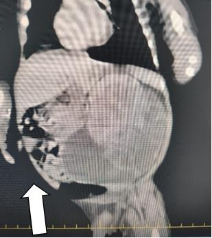 Image 2: Abdominal CT, 9x6 cm cystic space-occupying lesion with solid components in the left renal lobe