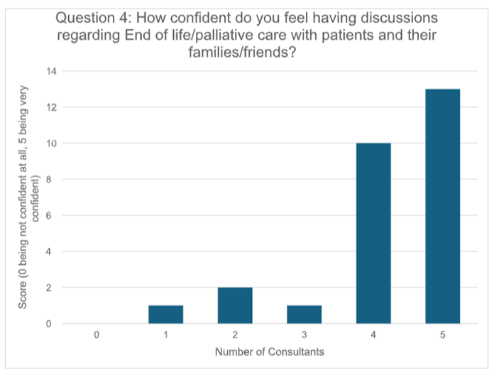 Question 4: How confident do you feel having discussions regarding End of life/palliative care with patients and their families/friends? (0 being not confident at all, 5 being very confident)