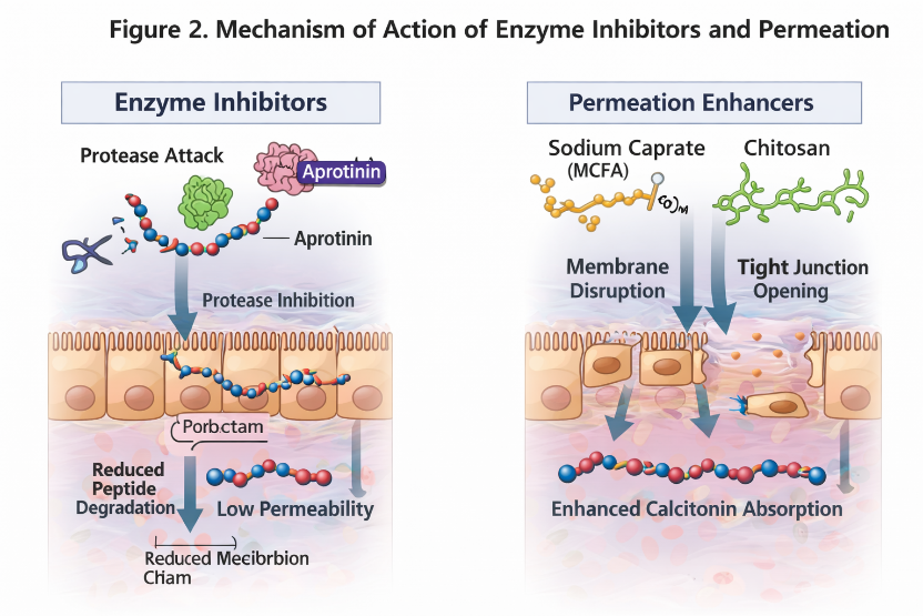 The evidence that was examined shows that enzyme inhibitors and permeation enhancers work together to enable an oral calcitonin delivery system [11,12]. The enzyme inhibitors prevent premature peptide breakdown while the permeation enhancers enable peptide transport through intestinal barriers [18]. The excessive control of epithelial permeability introduces severe safety issues because it results in two dangerous outcomes, which are mucosal irritation and higher vulnerability to bacterial infections [13,20].