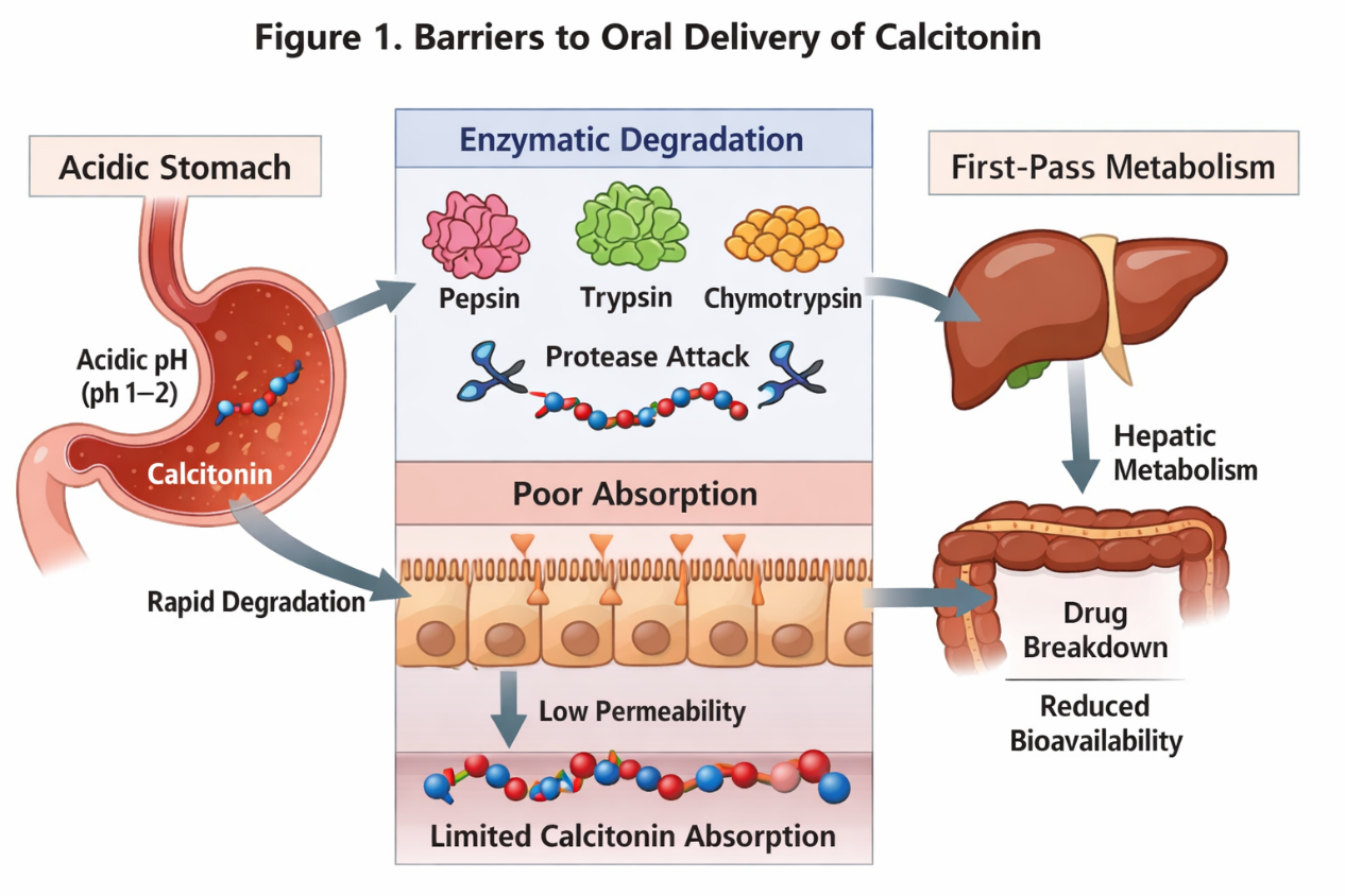 The intestinal tract presents two primary physiological obstacles that prevent calcitonin from being effectively absorbed through oral administration. These obstacles include the total breakdown of the drug by gastrointestinal proteases and the restricted movement of the drug through the intestinal epithelial cells, according to [7,8]. The peptide drugs, which enter the bloodstream from their original sites of administration, undergo immediate destruction through enzymatic action by pepsin, trypsin, and chymotrypsin according to [9]. The intestinal membranes block calcitonin from entering through passive diffusion because its large molecular weight and hydrophilic nature prevent passage, according to [10].