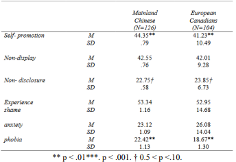 Hypothesis 2: Cultural differences are expected to emerge across the three facets of perfectionistic self-presentations, as well as in levels of shame, and social anxiety or social phobia. Specifically, individuals from Mainland China would be anticipated to report higher levels of perfectionistic self-promotion and greater experiences of shame than their Euro-Canadians. In contrast, Mainland Chinese participants would be expected to report lower levels of nondisplay and nondisclosure imperfections than European Canadians. This may be because European Canadians who strive to appear flawless and actively avoid revealing imperfections may experience greater psychological strain in challenging interpersonal situations, leading to heightened anxiety, fear, and avoidance behaviors. Moreover, shame is generally regarded as a maladaptive emotion in Western cultural contexts, whereas in Eastern cultures such as China, shame is often considered a more adaptive and socially regulating emotion. Consequently, these cultural distinctions are expected to contribute to systematic differences across perfectionistic self-presentation, shame, social anxiety and social phobia related outcomes.