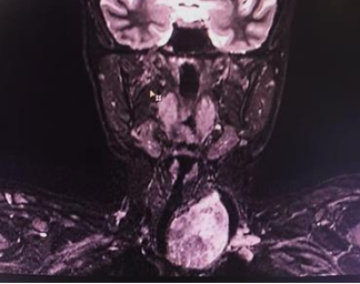 Figure 1: MRI neck showing left thyroid mass with retrosternal extension deviating trachea towards right and causing compressiveeffects over the structures in the neck.