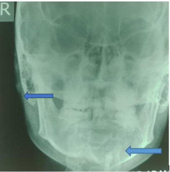 Figure 1: An anterior-posterior view of the jaw demonstrating a well circumscribed oval lucency with sclerotic margin over the crown and root of an unerupted tooth in the region of the body of the left hemi-mandible in keeping with the classical appearance of a circumferential form of dentigerous cyst (Left blue arrow).
