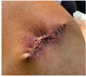 All remaining tissues were carefully washed with saline solution and soap to prevent infection, and a compressive dressing was applied. Dipyrone and Ibuprofen were prescribed for potential postoperative symptoms. At the postoperative wound review one week after the procedure, the lesion showed effective tissue repair with hyperemia and local pain (Figure 6).