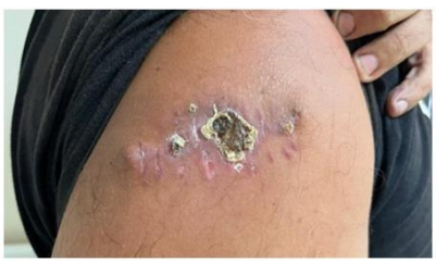 Male patient, 40 years old, self-identified as black, obese, rural worker, former alcoholic, diagnosed with systemic arterial hypertension controlled with Losartan, Atenolol, and Hydrochlorothiazide, with a surgical history of cholecystectomy in 2018 without complications. The documents provided by the patient indicate a vaccination history including: one dose of the diphtheria and tetanus vaccine, the yellow fever vaccine, one dose of the hepatitis B vaccine, the MMR vaccine, and the trivalent influenza vaccine. Regarding COVID-19 immunization, the patient received two doses of the Coronavac vaccine and one dose of the AstraZeneca vaccine. In 2022, following the simultaneous (i.e., same arm and day) administration of the AstraZeneca and trivalent influenza vaccines in the brachial region of the right upper limb, the patient initially experienced localized pain. One month later, he noticed the development of a small exophytic nodule in the proximal and lateral region of the right upper limb, specifically in the long head of the bicepsmuscle. The nodule exhibited rapid growth, acquiring characteristics of a tumor mass, and was accompanied by pain, bleeding, redness, ulceration, a putrid odor, and purulent discharge (Figure 1).