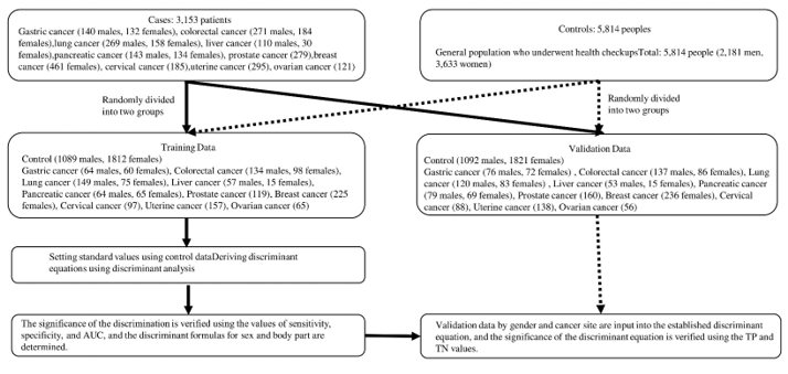 In a previous report [17], we developed a diagnostic method for cancer risk. In this study, we conducted a new case-control study by increasing the number of subjects and cancer site. The study flow is shown in Figure 1. The case and control samples used in the analysis were randomly divided into two groups based on gender and cancer site, with one group serving as training data and the other as validation data. Discriminant analysis was performed on the training data, and based on the discriminant equations derived for gender and cancer site, the individual case and control data assigned to the validation data were substituted into each discriminant equation to verify their discriminant ability. After validation, the case and control data from the training and validation data were combined to increase the number of subjects, and a binomial logistic regression analysis was performed. We aimed to put the newly derived regression equation into practical use as a cancer risk estimation equation.
