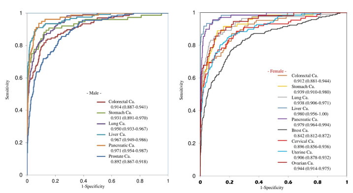 The analysis results showed high sensitivity and specificity, with AUCs ranging from 0.737 to 0.993, indicating effective discrimination. Furthermore, the positive predicted values were higher than the theoretical predicted values for pancreatic and prostate cancer in men, and similar to the theoretical predicted values for stomach and colorectal cancer in women.