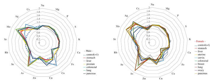 The radar charts show the ratios of the average values of 17 elements measured by ICP-MS in six cancer sites in men (left figure) and nine cancer sites in women (right figure), with the control average set to 1.0. In both men and women, Co, Cu, As, Mo, and Ag were higher than the control, while Fe, Zn, Rb, and Cs were lower. However, the ratio patterns of the 17 elements differed in both men and women depending on the cancer site.