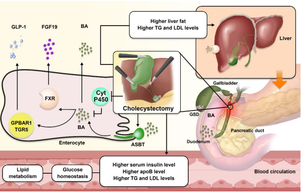 Cholecystectomy is the most appropriate treatment option for gallstone disease (GD), while this treatment can cause metabolic syndrome through unknown mechanisms [29]. A study by Chen et al to investigate the main role of gallbladder in metabolic homeostasis has shown that the prevalence of metabolic disorders (for example NAFLD, diabetes, etc.) is due to its effect on glucose concentration, lipids, blood pressure and cardiovascular disease is more common in people who have had a cholecystectomy. After this surgery, a significant number of impaired GD functions, reduced intestinal trans-flow, and eventually rapid recirculation of the hepatic intestinal tract BAs, which act as signal molecules, will interfere with the expression of the BAs / FXR and BA / GPBAR-1 axis genes. Also, GPBAR-1 destroys the gallbladder [30]. Another study by Cortés V et al on non-obese Spanish patients with gallstones undergoing cholecystectomy showed that two years after surgery, there was a significant increase in serum insulin levels, the HOMA index. -IR, serum apoB levels and liver fat content were seen. Another study noted that after cholecystectomy, we saw decreased postprandial blood sugar control, increased serum and liver triglyceride levels, and LDL production. In these patients, we see a decrease in the concentration of duodenal BA after food intake, while serum levels of the hormone incretin, glucagon-like peptide-1 (GLP-1) remain constant. Also, the metabolic effects of cholecystectomy increase the concentration and probability of tissue exposure to BAs and the rate of basal metabolism, which can affect glucose and lipid homeostasis and increase the risk of hypertension and cardiovascular disease [31]. Gallbladder (GB) is a physiological pacemaker of BA hepatic circulation [30]. And the main function of the gallbladder (GB) is to absorb water and ions by epithelial cells and store bile. [29] This function is controlled by neuro-hormonal mechanisms [30]. Higher hepatic bile concentration than GB increases the digestibility of hepatic bile. GB also has motor function, which plays an important role in regulating BA flow in the intestinal circulation. This current affects the regulation of body homeostasis, BAs, cholesterol and TGs. After cholecystectomy, hepatic bile is secreted frequently in the duodenal lumen and BA circulates more rapidly, exposing most of the body's organs to this flow [29]. Cholecystectomy also prevents inhibition of cytochrome P450 1A1, an enzyme that limits the rate of bile acid synthesis, and increases the expression of ileal apical sodium-dependent bile acid transporter (ASBT) [31]. A can act as a hormonal signal by interacting with a variety of enteropathic and peripheral receptors. One of these receptors is the X farnesoid receptor (FXR), a ligand-activated transcription factor that responds to BA and is involved in glucose homeostasis. It is also a BA receptor with G protein (GPBAR1 / TGR5) that is expressed in human tissues (especially brown fat and skeletal muscle cells) to increase energy expenditure. BAs regulate glucose homeostasis by modulating this receptor in the small intestine and modulate insulin sensitivity. Activation of FXR protein, which improves insulin sensitivity, decreases PG concentration by decreasing gluconeogenesis, and increases glycogen synthesis, is involved in regulating energy intake, lipid metabolism, and glucose homeostasis [29]. In a study by Amigo L et al, it was shown that increasing the activity of the receptors mentioned above does not help human metabolism. A large part of the BA pool in the fasting person is divided into GB. In people who have undergone cholecystectomy, rapid release of BA into the duodenum does not occur after receiving food, whereas if GB is healthy, it can increase the concentration of BA in the duodenum up to 10 times after a meal. People with cholecystectomy can’t develop an immediate response to control lipid and glucose levels after eating compared to healthy people [29]. Fibroblast growth factor 19 (FGF19) is secreted in high concentrations in bile, which plays a significant role in lipid metabolism, glucose, and regulation of fasting energy levels. It also reduces the concentration of TGs and cholesterol, increases glycogen synthesis and suppresses insulin-induced fatty acid synthesis in the liver. GB mucosa is the site for enterohepatuliary expression of this factor. Studies show that ablation of GB reduces the serum concentration of this factor and increases the risk of metabolic disorders. GB ablation also suppresses Gpbar1 / TGR5 signals on the epithelial bilayer and GB smooth muscle, affecting and disrupting metabolic homeostasis [29].