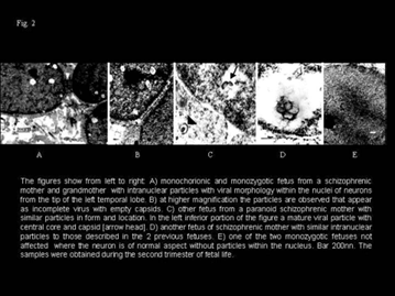 2. It can be a viral infection in the fetuses and the patients related with the etiology of the illness. In this sense several favorable circumstances converge: A. Second pregnancy trimester B. Family antecedents of schizophrenia and of severe neurodevelopmental disturbances C. Presence of an incomplete viral form D. Affectation of the neurons and of the nucleus mainly E. Discordance of infection in monozygotic twins F. Ultra-high risk. Familial aggregation of schizophrenia. Mother and grandmother schizophrenics and two schizophrenic’s aunts in twins. Congenital malformations in two uncles. G. None signs or clinical symptoms of infection were observed in the mothers neither in the fetuses H. Not inflammatory reaction in the brain tissue I. Similar previous findings in adult schizophrenics and in experimental animals J. Samples from the tip of the left temporal lobe K. Relationship with the herpes simplex hominis type 1 virus L. Similar findings in other fetuses from schizophrenic mothers not in controls M. Similar findings in the placenta in one study