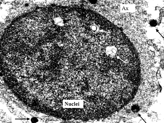 Figure 1: Incomplete viral particle’s [white arrow] within the nucleus of a neuron of a monozygotic twin foetu's from a paranoid schizophrenic mother and grandmother.