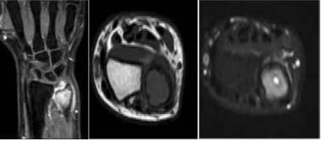 Figure 2: MRI of the Left Wrist showing hypointense signal in the T1 sequences and a hyperintense signal in the short TI inversion recovery (STIR) sequences.