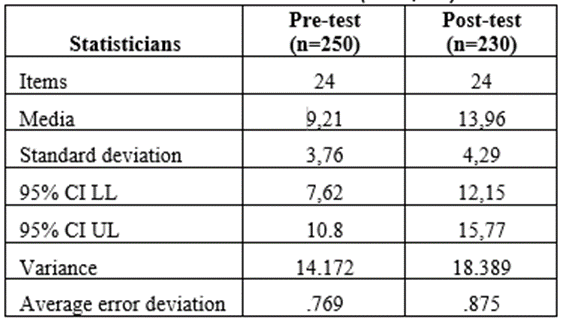 Tables 2, 3 and 4 illustrate the results of the evaluation before and after. There is a significant increase over to the average number of items / questions answered / answered correctly between “before” (M = 9.21, SD = 3.76) and two months “after” the educational intervention (M = 13.96, SD = 4.29), t (23) = 11.73, p less than 0.000. The power reached (1- β) was 98%.