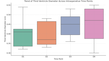 Non-parametric test for repeated measures (Friedman test) revealed a statistically significant difference in third ventricle diameters across the four intraoperative time points, (p-value= 0.0062). Post-Hoc pair-wise comparisons using the Wilcoxon Signed-Rank Test showed a statistically significant change in the third ventricle diameter over the course of surgery i.e. between skin incision (D2) and skin closure (D3) (p < 0>