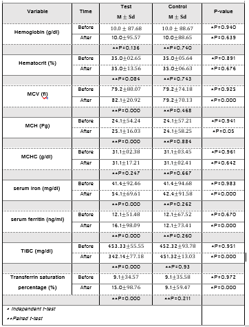 The comparison of the mean indicators of IDA before the intervention between the test and control groups with the independent t-test did not show any significant difference(P>0.05), and the two groups were the same. However, the comparison of the mean indicators of iron deficiency anemia, except for Hb, HCT, and MCHC, after the intervention in the test and control groups showed a significant difference(P≤0.05).