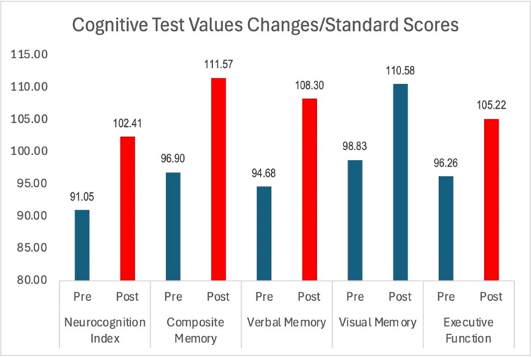 The NCI improved from 91.05 to 102.41, while composite memory started at 96.9 and increased to 111.57. With respect to isolating specific memory scores, the verbal memory values changed from 94.68 to 108.3, while visual memory scores started at 98.83 and finished at 110.58. Executive function had a starting mean of 96.26 and concluded at a mean score of 105.22. All changes were statistically significant, as noted by the test scores for each category.