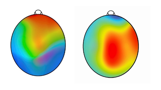 The topographic maps depict in visual form the brain's activation during the p300 assessment. Cool colors, like blue and green, indicate low activation. Warm colors, such as yellow, orange, and red, scale upward, indicative of more activation. As individual topo maps vary, the subjects were combined in two pre-versus post-intervention composite graphics. This image, Figure 4, mirrors visually the changes in total reaction time and decreased trail-making score time.