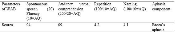 The participant’s performance on the various sub sections of Western Aphasia Battery (presented features of Broca’s Aphasia. Further, to screen for cognitive deficits, Mini Mental Status Examination (MMSE) was administered. Performance of the participant is summarized in Table 2.