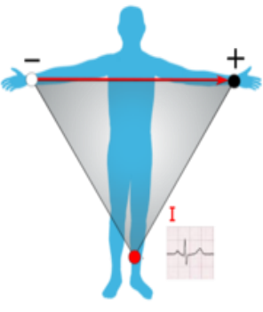 Figure 8: The human hands are polarized in such a way that the left hand has a predominantly positive charge (potential), and the right hand has a predominantly negative charge; it is this potential difference that is measured when recording an electrocardiogram (bottom right) [16].