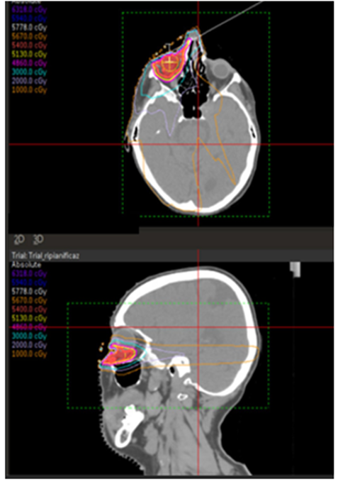 At the first follow up visit in November 2023, the patient was in good general condition, the acute toxicity was solved, and she did not show any late toxicity except for slight blurred vision on the treated side. Moreover, the tumor appeared in partial response.