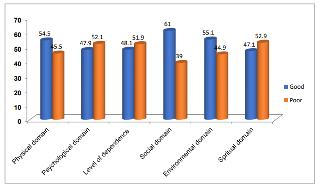 Results: This study depicted that 48.2% (302) of the respondents had poor overall quality of life. Furthermore, the descriptive analysis depicted that 29.2% (183) of the respondents had rated their Quality of Life as poor; additionally, over half (59.9%) of the respondents were satisfied and perceived their health as good. Out of the 302 respondents with poor overall Quality of Life, more than half, 67.9% (205), were depressed, and those enduring depression had 3.39 times higher chance of reporting poor overall Quality of Life than their counterparts, and depression was statistically associated with poor overall Quality of Life.