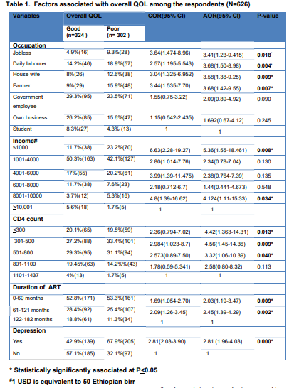 Occupation, income, CD4 count, duration of ART use, and depression were significantly associated with the poor overall QOL. In this study, respondents who had lower monthly income had poor overall QOL compared to those who had higher monthly income. This association was also statistically significant with AOR=5.36 (95% CI; 1.55-18.46) (Table