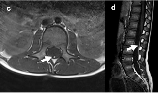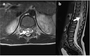 T2-weighted axial (a) and sagittal (b) MR image demonstrating a pointed conus medullaris with associated syringomyelia (arrows) with a maximum diameter of 5mm. The underlying reason is a tight fatty filum (arrows), which can be seen in the corresponding T1-weighted axial (c) as well as sagittal (d) MR images.