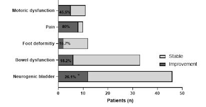 Post-surgery, bladder dysfunction improved in 26.1% of patients (p=0.04), while 73.9% maintained stable symptoms. Two previously non-ambulatory patients gained the ability to walk. Foot deformities improved in 16.7% of cases, and bowel dysfunction in 18.2%, with most patients showing stable symptoms. Notably, no symptoms worsened during the follow-up period. Scoliosis was present in nine children (15.5%) preoperatively, though no follow-up data is available on its improvement. The five asymptomatic children remained symptom-free throughout the follow-up period.
