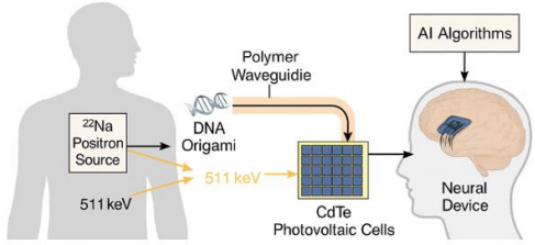 through biocompatible polymer waveguides (e.g., polyethylenebased, 1 mm diameter) with 95% transmission efficiency over 10 cm [26, 3]. The waveguides, coated with DNA origami to enhance biocompatibility, direct gamma rays to CdTe-based photovoltaic cells, achieving 92.5% energy conversion efficiency [29]. The system generates 106 W/kg, sufficient for Neuralinks ICMS (50500 µA pulses) [18]. AI algorithms monitor transmission losses and adjust waveguide alignment, reducing energy waste by 15% [24].