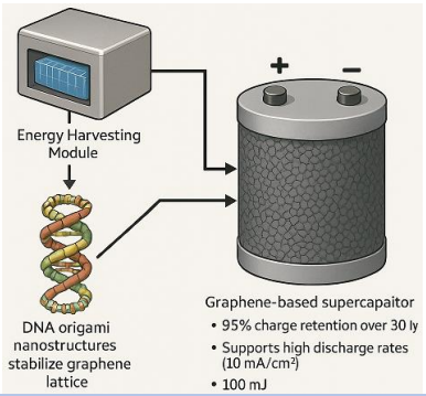 Figure 3: A graphene-based supercapacitor, integrated with the energy harvesting module, stores electrical energy from gamma ray conversion [11]. The supercapacitor achieves 95% charge retention over 30 days and supports high discharge rates (10 mA/cm²), ensuring stable power for Neuralink arrays [16]. DNA origami nanostructures stabilize the graphene lattice, reducing degradation by 20% during chronic implantation [17]. The storage system, with a capacity of 100 mJ, supports continuous operation for 6 months without recharge.