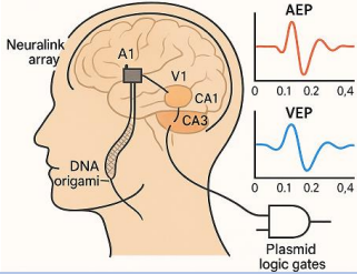 Neuralink arrays deliver ICMS to primary auditory (A1), visual (V1), and hippocampal (CA1/CA3) regions, encoding sensory and memory engrams [18, 19]. DNA origamigraphene electrodes enhance stimulation precision, supporting 94.3% visual and 94.2% auditory classification accuracy [7, 8]. AEPs and VEPs provide real-time feedback, improving pattern discrimination from 61.5% to 89.8% over five sessions [10]. Plasmid logic gates validate engram formation with 87% success [23, 4].
