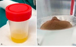 Figure. 2 - A): Aspirated cystic content; B) Anatomical piece, mural nodule removed.