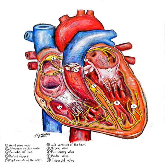 The task of the conduction system is to activate impulses and distribute them throughout the heart muscle. The excitation wave that is generated in this node is not recorded in the ECG until it leaves its area. The electrical stimulus, leaving the sinoatrial node (SA), spreads simultaneously in the conduction paths in the atria and in the muscle cells. The differences in electrical impulses between the left and right ventricles of the heart are important from the point of view of their function. Since the work of the left ventricle is much more intensive than that of the right ventricle, the dimensions of their walls also differ. The wall of the left ventricle is about 15 mm thick, which makes it more durable, while the wall of the right ventricle is much thinner, reaching only about 5 mm thick. This difference results from the fact that the pressure in the left ventricle is much higher than in the right ventricle, which requires a greater force of contraction of the heart muscle. Due to the effort it has to perform, the left ventricle of the heart is more susceptible to damage and failure than the other parts of the heart. Heart attacks, which are a serious threat to life, more often affect this part of the heart than others. Hypertrophy of the muscle and change in the geometry of the left ventricle are often the result of hypertension. Increased left ventricular mass may be an early diagnosis of hypertensive heart disease (Cudnoch-Jędrzejewska, Puchalska, Kowara 2024).