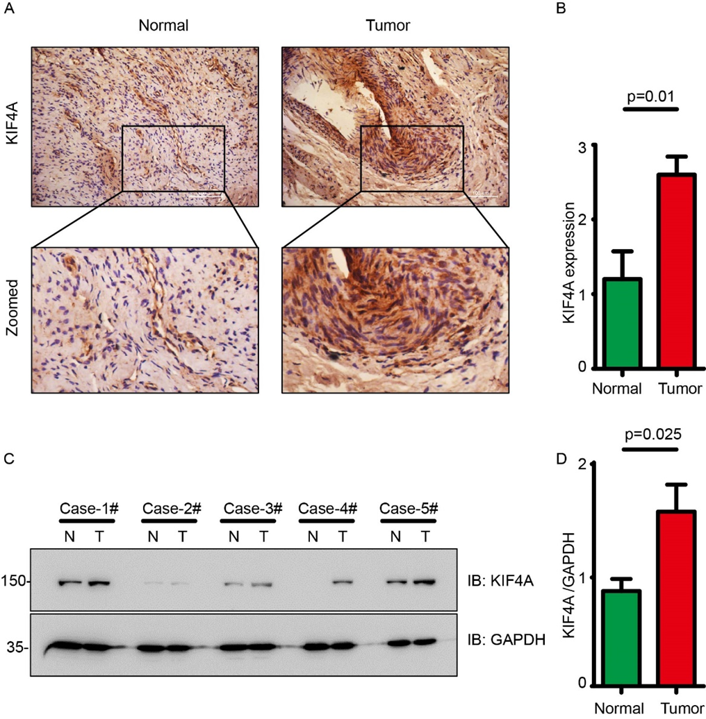 Figure 2. The clinical expression pattern of KIF4A in cervical cancer. (A). Immunohistochemistry staining of KIF4A in cervical cancer tissues and paired normal tissues. (B) Quantitive analysis of immunohistochemistry staining in panel A. (C) Western blot of KIF4A in the cervical cancer tissues and paired normal tissues. N: normal, T: tumor. (D) Quantitive analysis of western blot in panel C. (normalized with GAPDH).